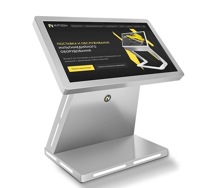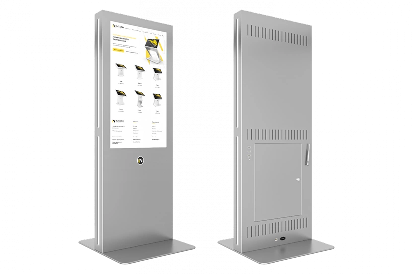 Интерактивный киоск включает дисплей с яркостью от 400 до 600 кд/м² с автоматической адаптацией к внешнему освещению для комфортной работы без бликов и отражений.